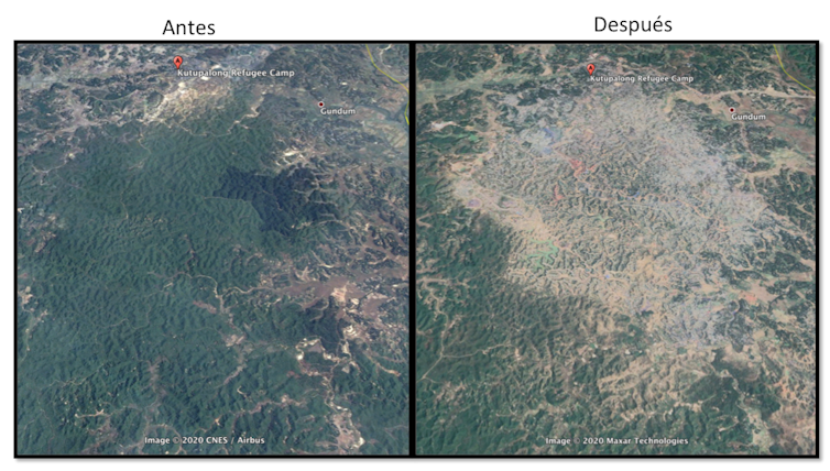 El campo de refugiados se estableció tras la tala del bosque que antes dominaba el área. La degradación forestal continuó tras su establecimiento, ya que los rohinyás dependen de él para el suministro de leña. Es fácil imaginar la rapidez con la que se esquilma un bosque cuando casi un millón de personas acuden a él regularmente para aprovisionarse de madera.